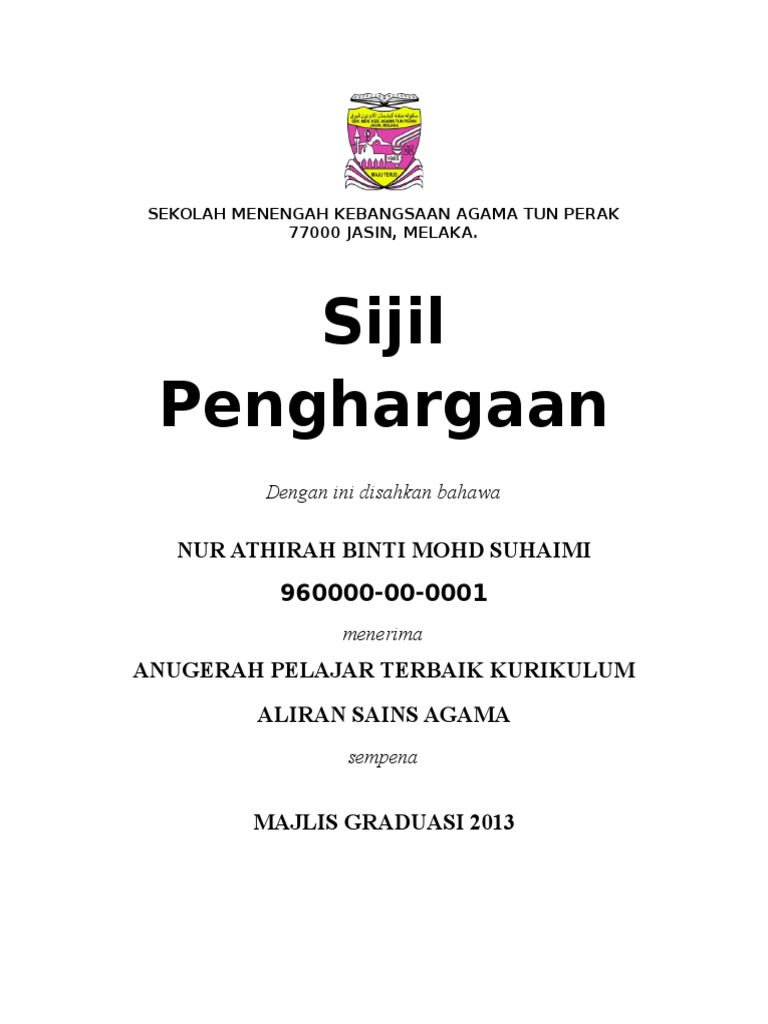 Sijil Penghargaan Nur Athirah Binti Mohd Suhaimi 960000 00 0001 Anugerah Pelajar Terbaik Kurikulum Aliran Sains Agama